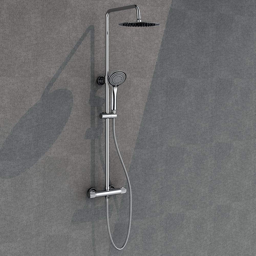 215,00€El precio original era: 215,00€.92,14€El precio actual es: 92,14€. _PVPAñadir al carritoColumna de ducha con tubo redondo extensible de 80 a 120 cm. y grifería termostática con desviador integrado. Ducha de mano para hidromasaje y rociador superior redondos
