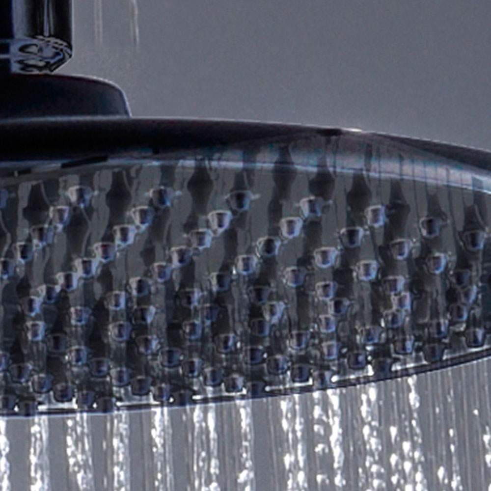 El rociador negro mate fabricado en ABS tiene un estilo moderno y funcional, nuestro rociador de ducha tiene un diseño redondo 20 cm de diámetro. además es plano, lo cual dotará al conjunto de tu columna de ducha de un estilo moderno. el agua cae con un efecto lluvia estable y uniforme que te encantará.