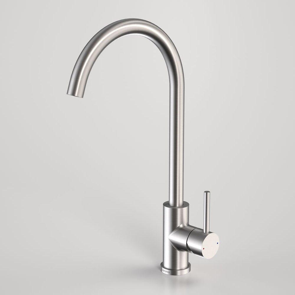 Grifo monomando de caño alto modelo VER para fregadero. Diseño redondo fabricado en latón con acabado en acero cepillado anti-huellas. Altura total 36 5 cm