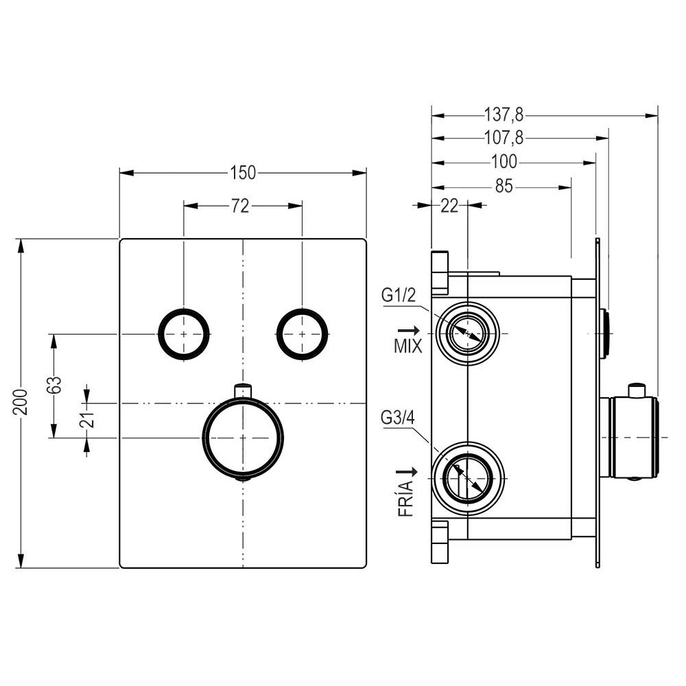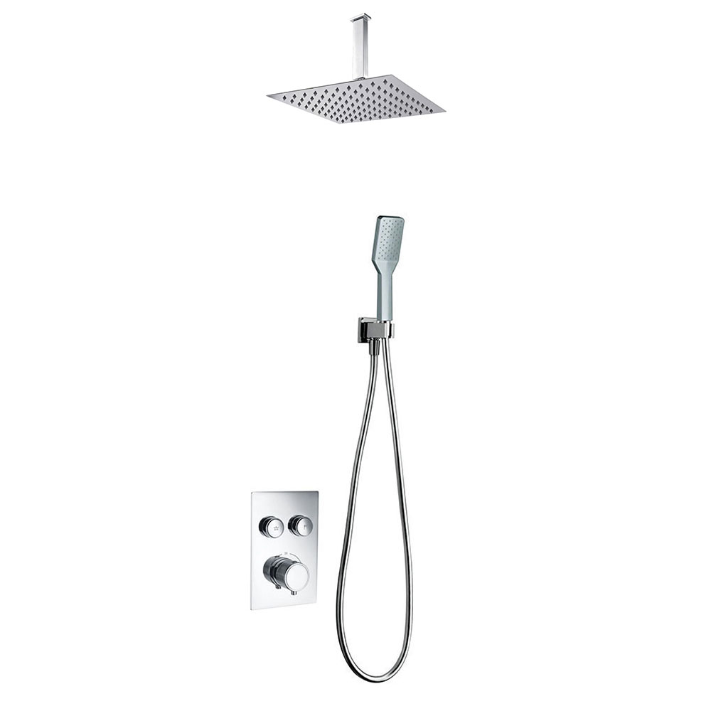 Grifo termostático de ducha para empotrar 2 vías PUL. Salida techo. Acabado con manetas redondas y pletina cuadrada, en cromo brillo