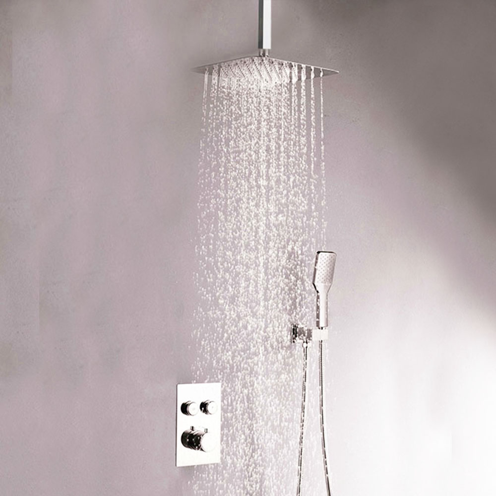 Grifo de ducha de empotrar de sistema termostático, con 2 vías para salida agua a través del duchón rociador de techo y por la salida del mango maneral de ducha de mano. Ahorra espacio con la grifería empotrada de Llavisan. El sistema de ducha quedará en el interior de la pared y siempre que lo necesites podrás acceder al cartucho simplemente retirando la placa metálica embellecedora.