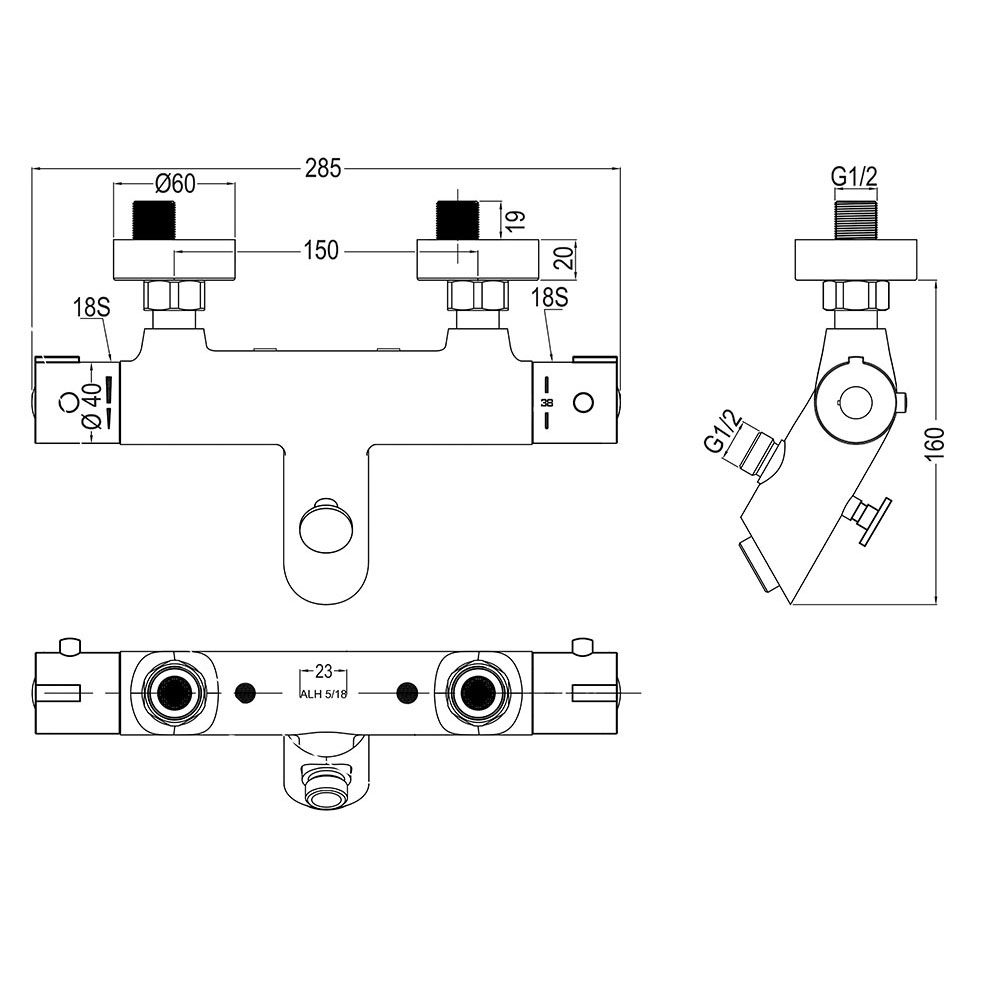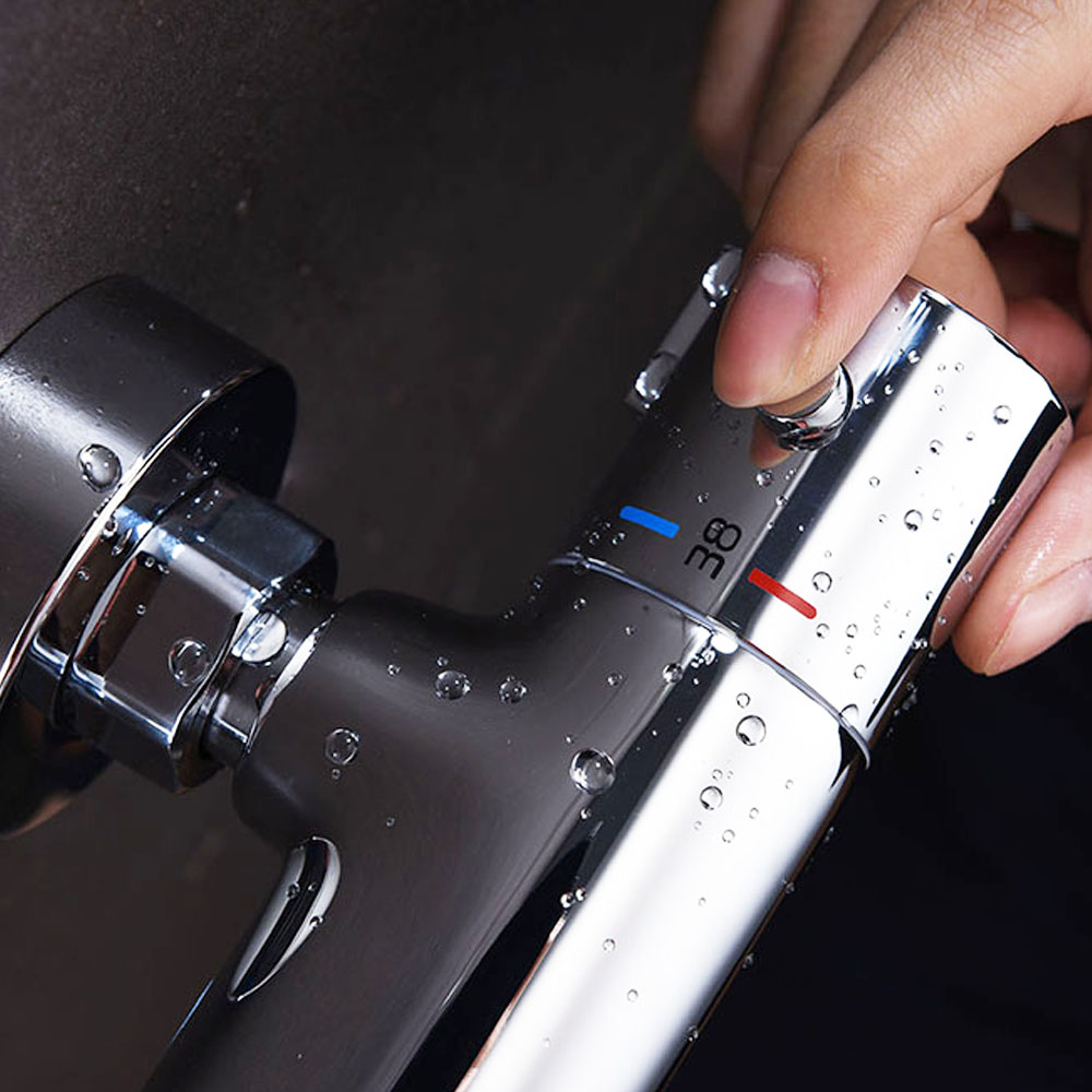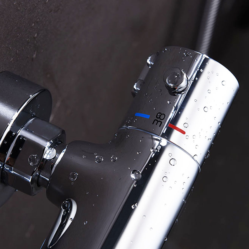 Grifo termostático para bañera BON manetas de zinc. Fabricado en latón macizo y acabado en cromo brillo. Con botón de seguridad antiquemaduras. Salida de 2 vías de agua