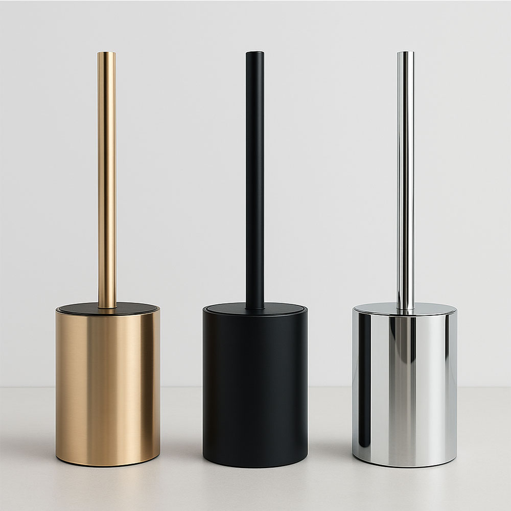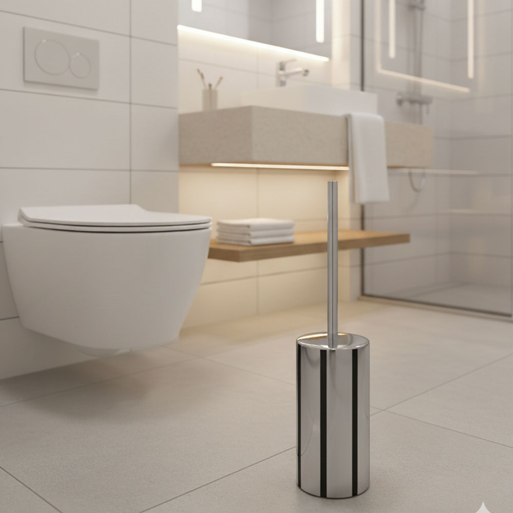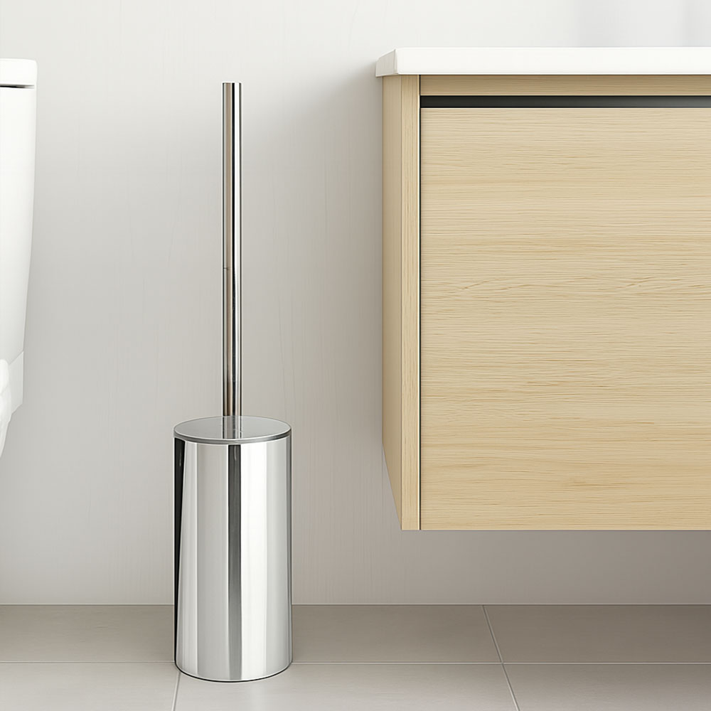 Escobillero redondo. Fabricado en acero inoxidable y acabado en cromo brillo. No se oxida y tiene vaso contenedor para escobilla de fácil limpieza.
