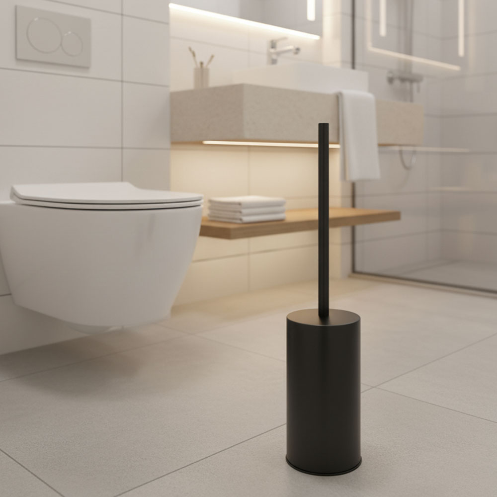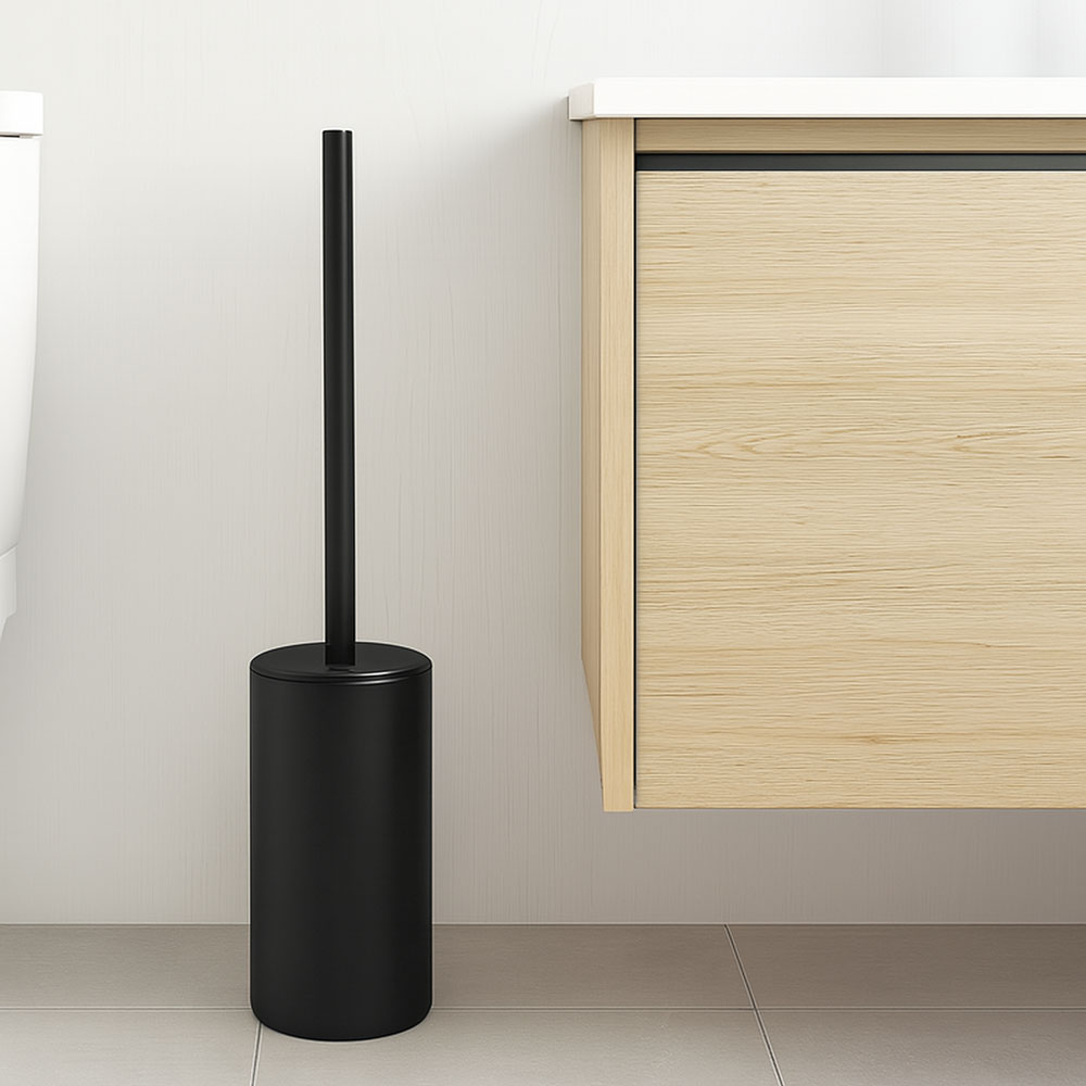 Escobillero escobillero redondo. Fabricado en acero inoxidable y acabado en NEGRO MATE. No se oxida y tiene vaso contenedor para escobilla de fácil limpieza. Elige