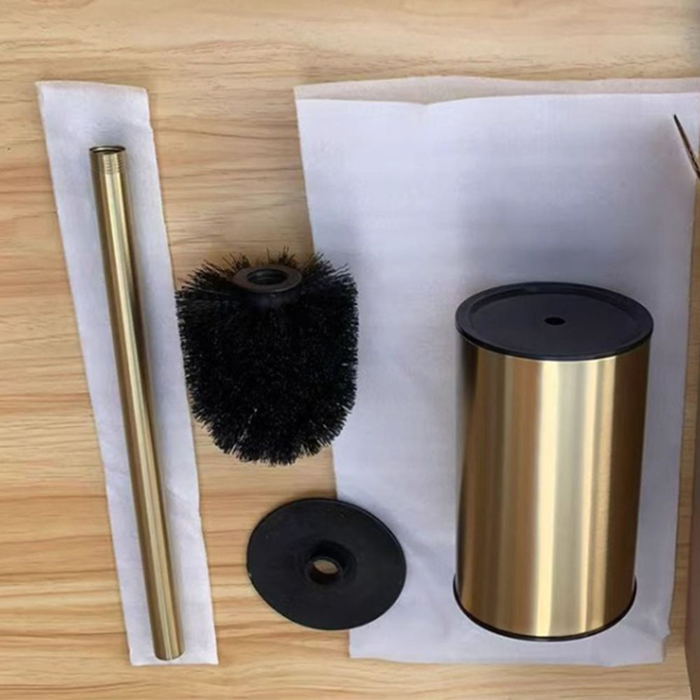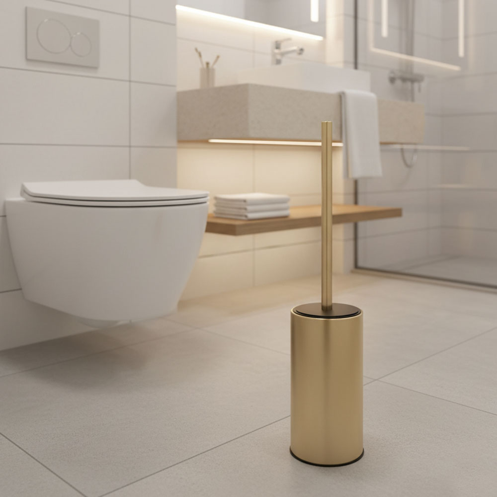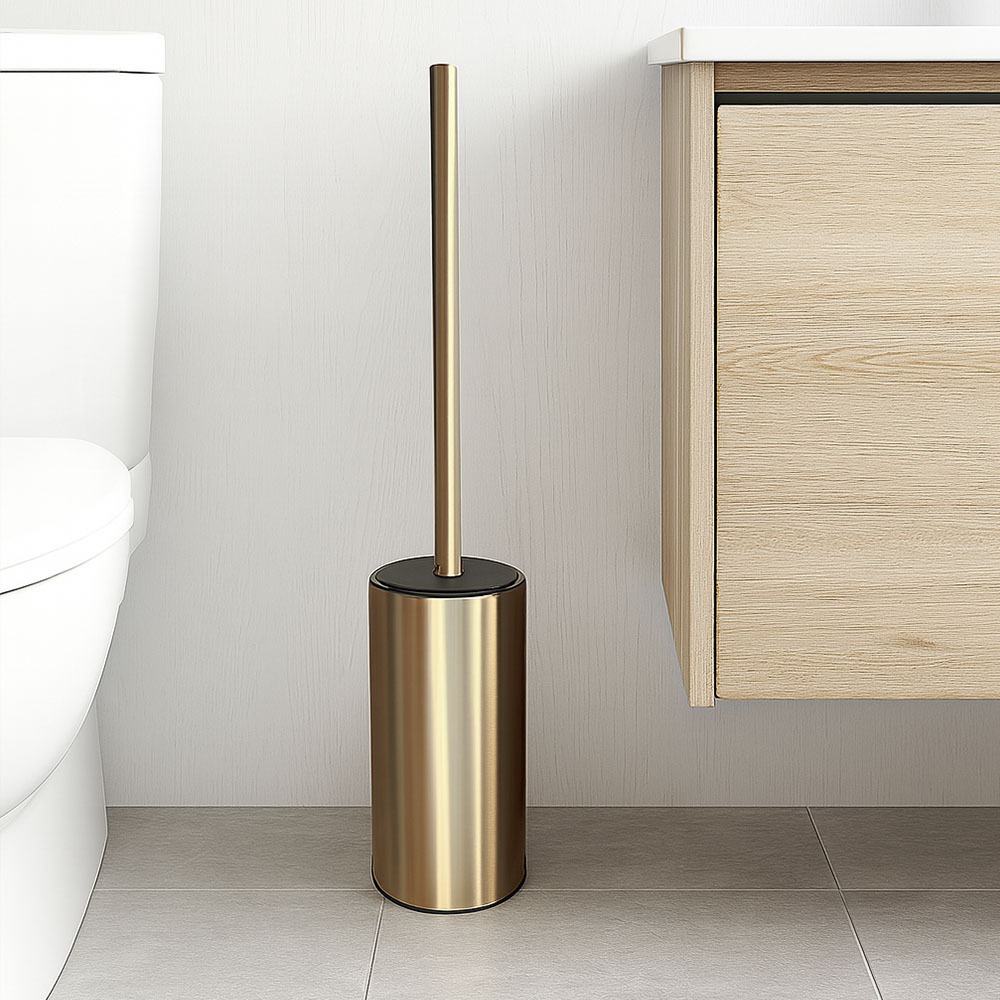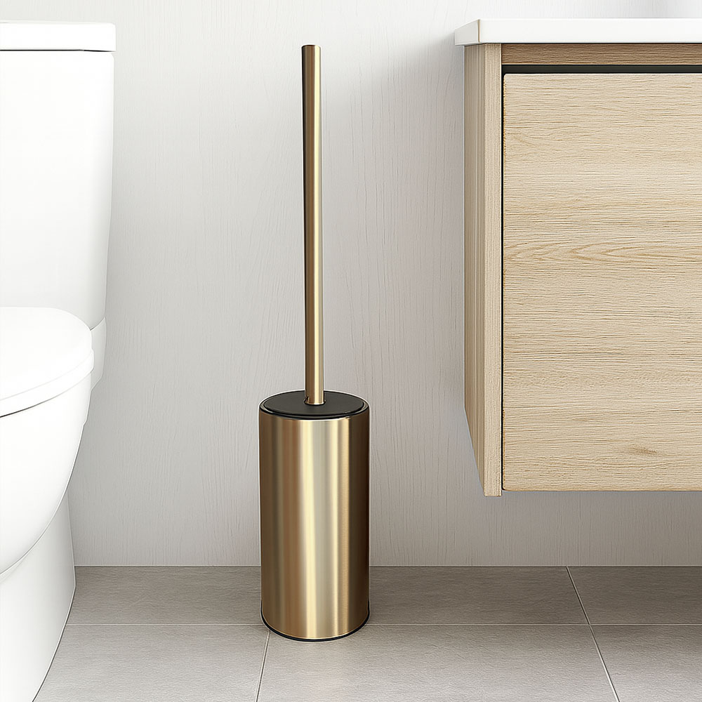 Escobillero escobillero redondo. Fabricado en acero inoxidable y acabado en ORO CEPILLADO. No se oxida y tiene vaso contenedor para escobilla de fácil limpieza.