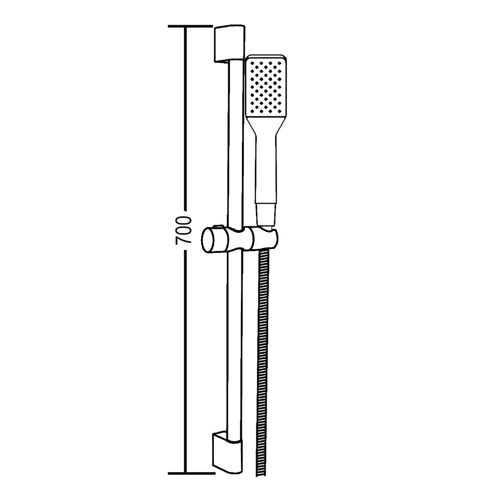 - – Barra de ducha de acero inoxidable – Mango / maneral de ducha de mano en ABS – Flexo de acero inoxidable – Soporte deslizante para ducha de mano en ABS – Juntas de estanqueidad – Tacos y tornillos de colocación