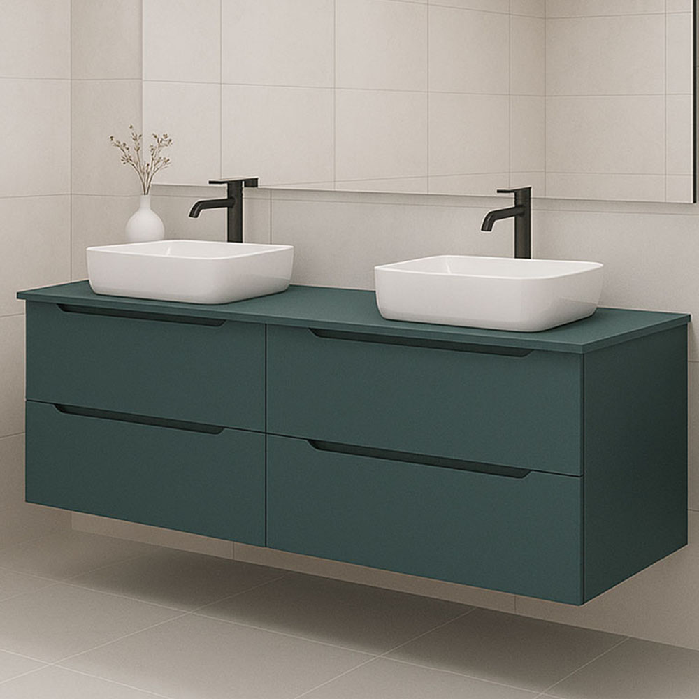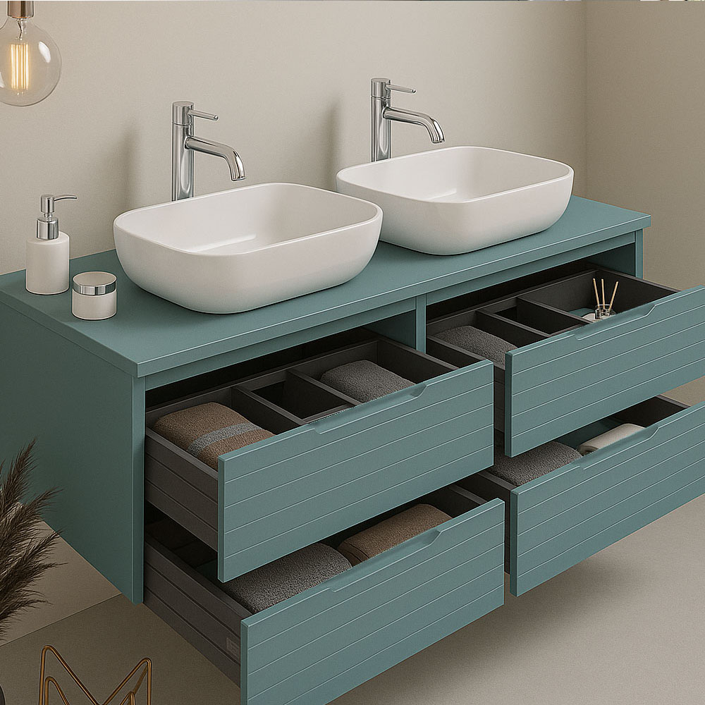 El Mueble de Baño Con Lavabo sobre encimera de 2 cajones suspendido ya viene montado de fábrica (son 2 módulos de 60 cm), solo tendrá que colocar el lavabo. Este muebl