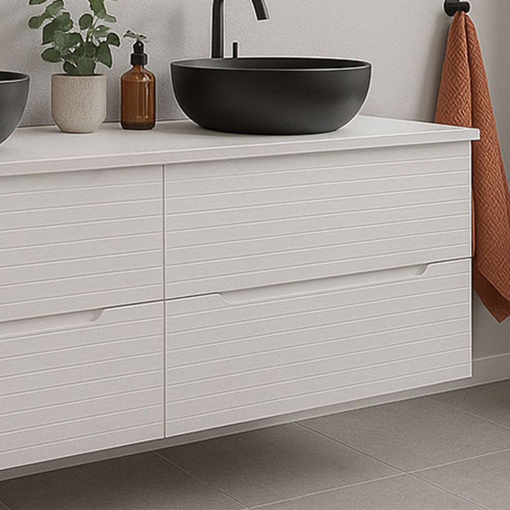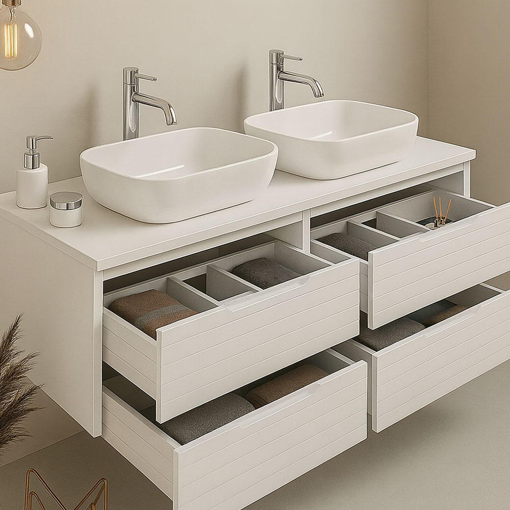 El Conjunto de Mueble de Baño sobre encimera de 2 cajones suspendido ya viene montado de fábrica (son 2 módulos de 60 cm), solo tendrá que colocar el lavabo. Este mueb