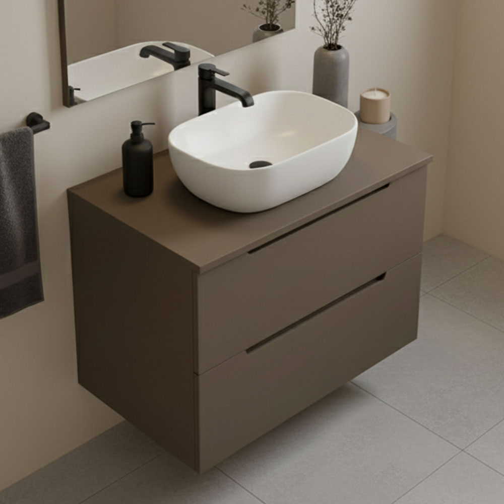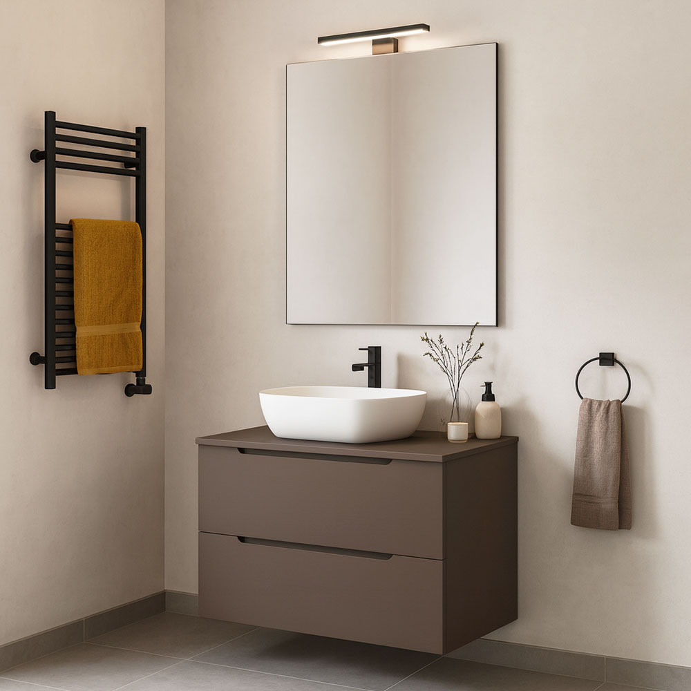 Kibath Mueble de baño con Lavabo, Espejo y Aplique LED VICTORIA 80×45 cm acabado Moka mate 2 cajones suspendido