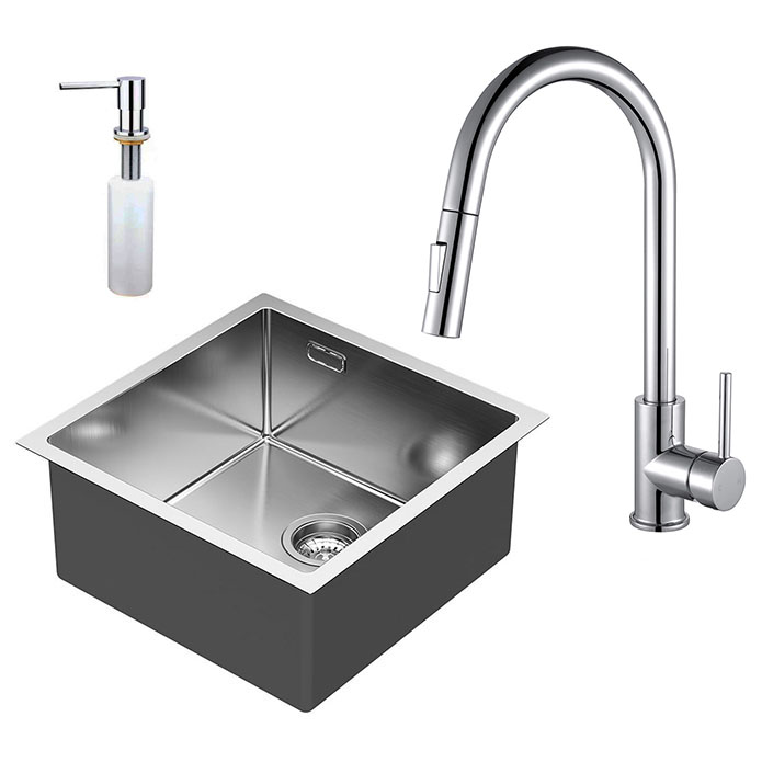 - – Fregadero de acero inoxidable – Grifo de cocina extraible – Dosificador de gel para fregadero – 1 válvula de desagüe con rebosadero – Tapón acero inox. – Rejilla desague